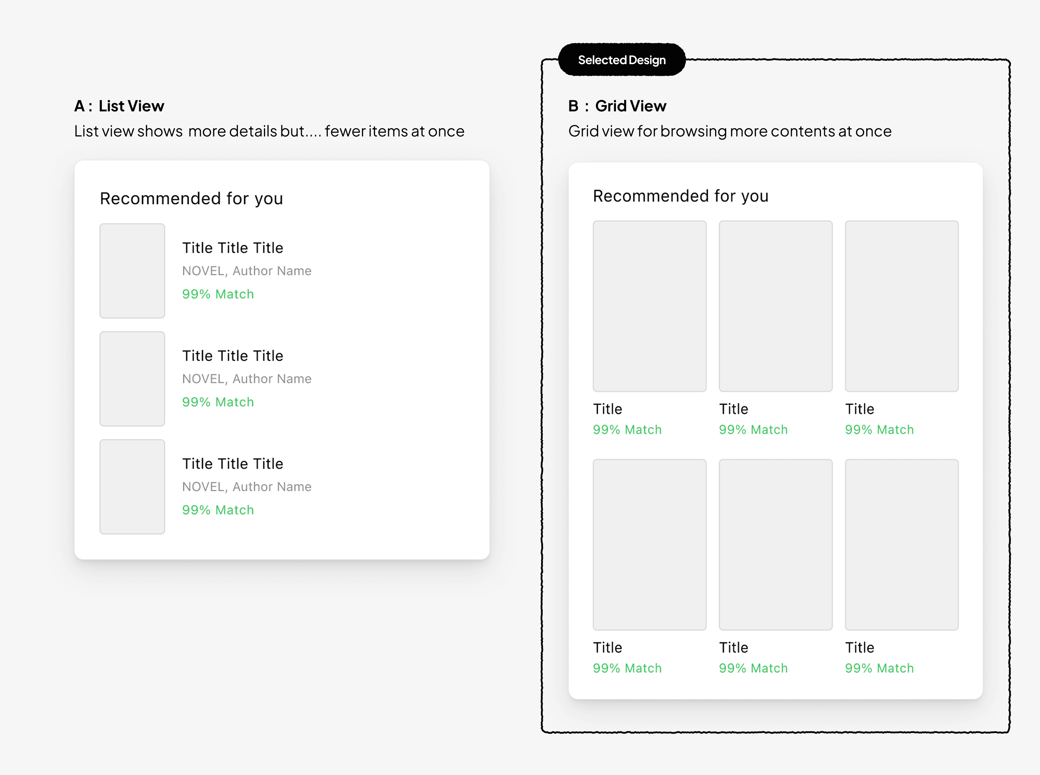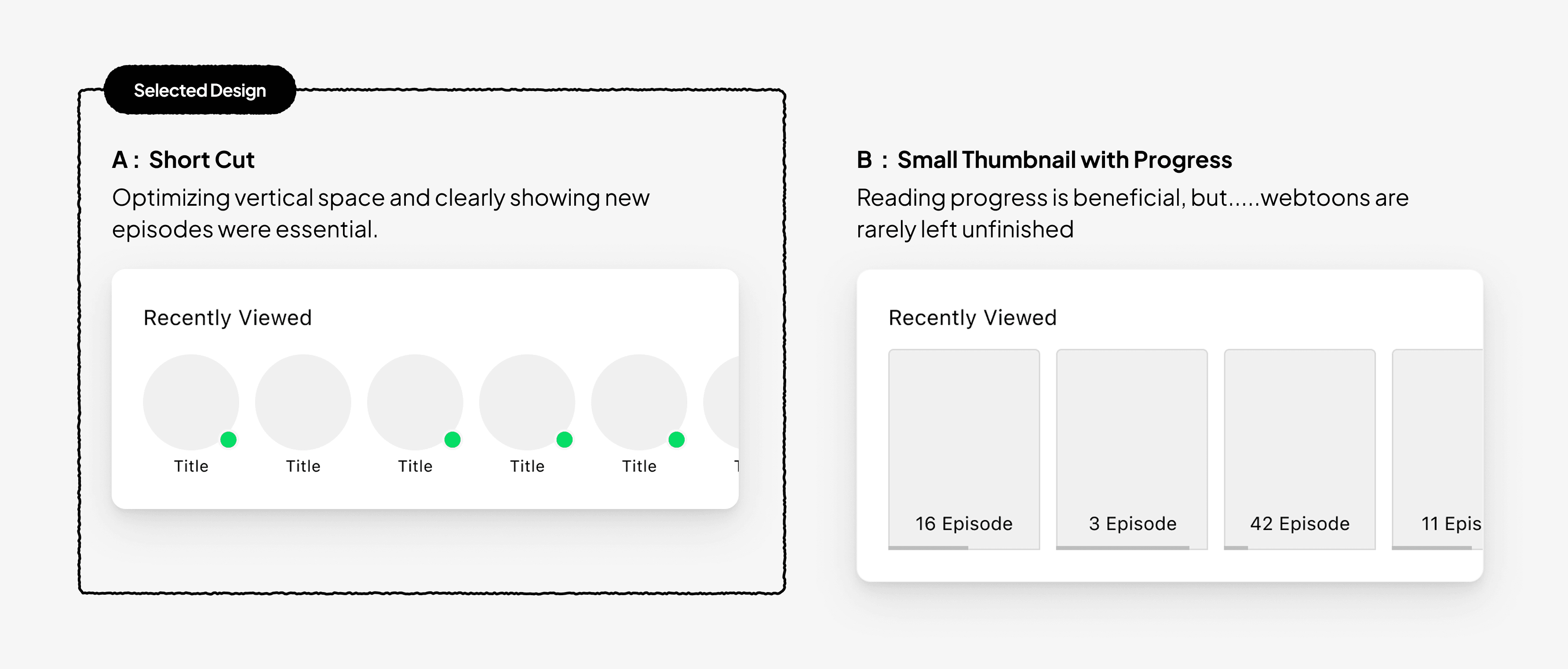 To make new recommendations more visually engaging while still informative, I explored variations inspired by Netflix and Webtoon patterns. The goal was to find the optimal balance between visual pull and information density.