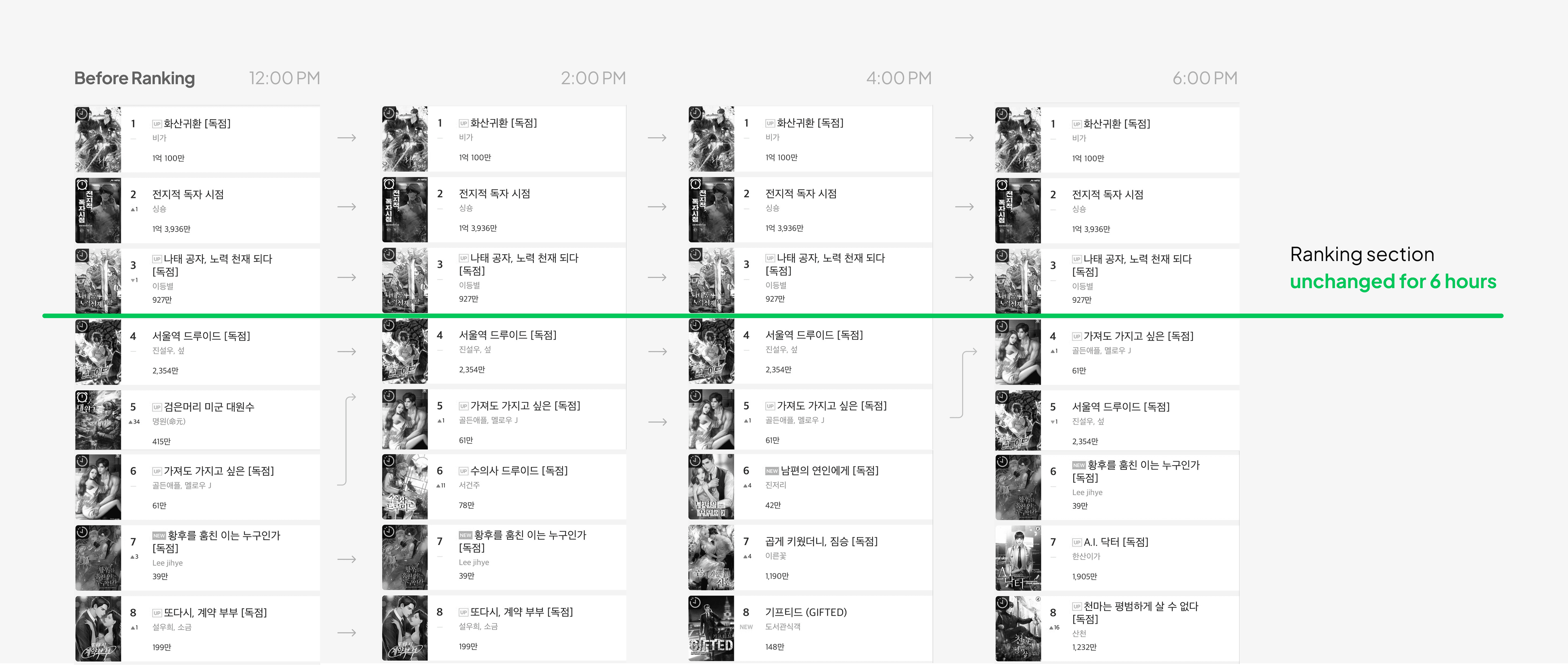 The static, sales-driven ranking kept the same top titles in place for hours, preventing new or niche contents from gaining exposure and severely limiting discovery opportunities across the platform.