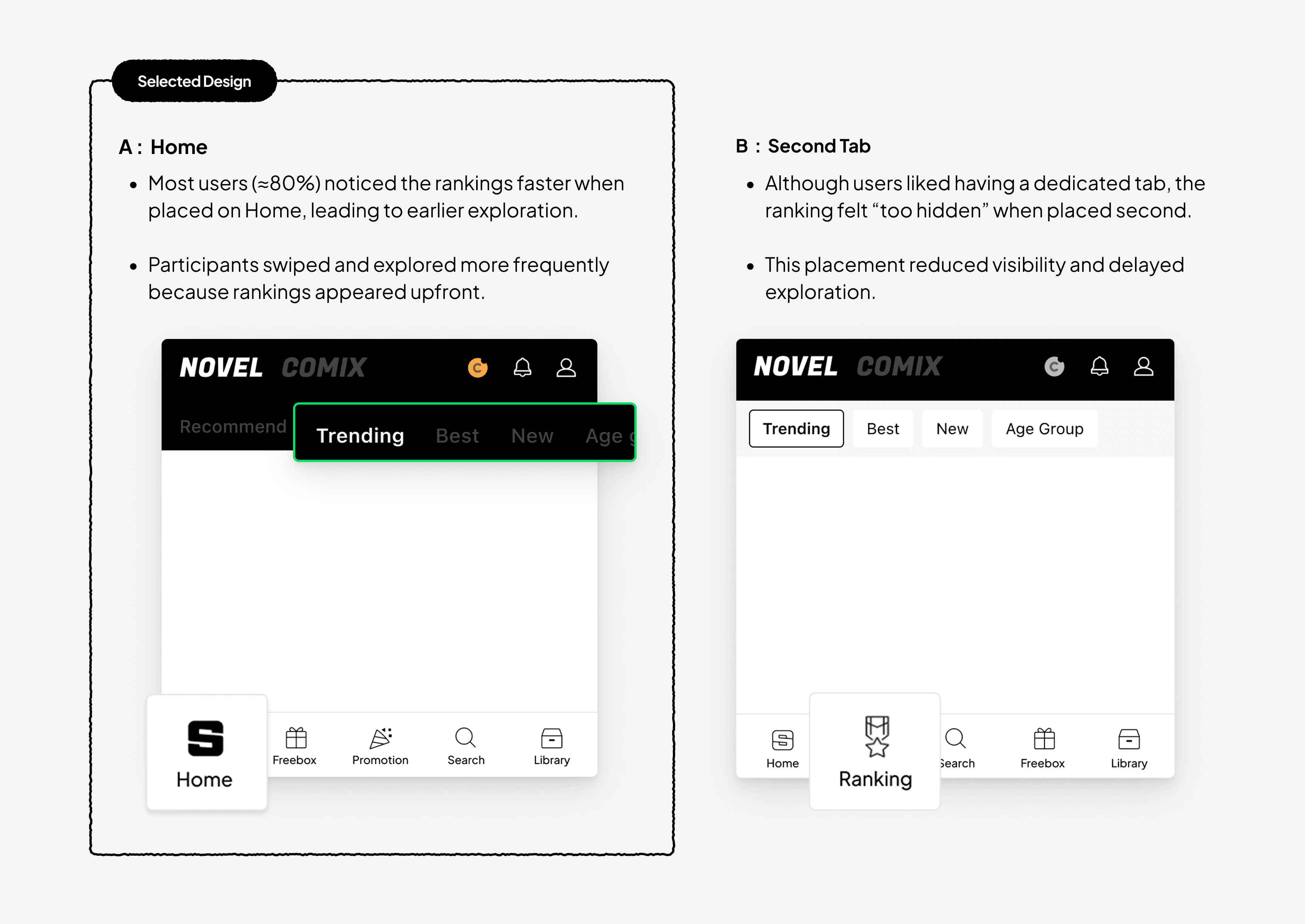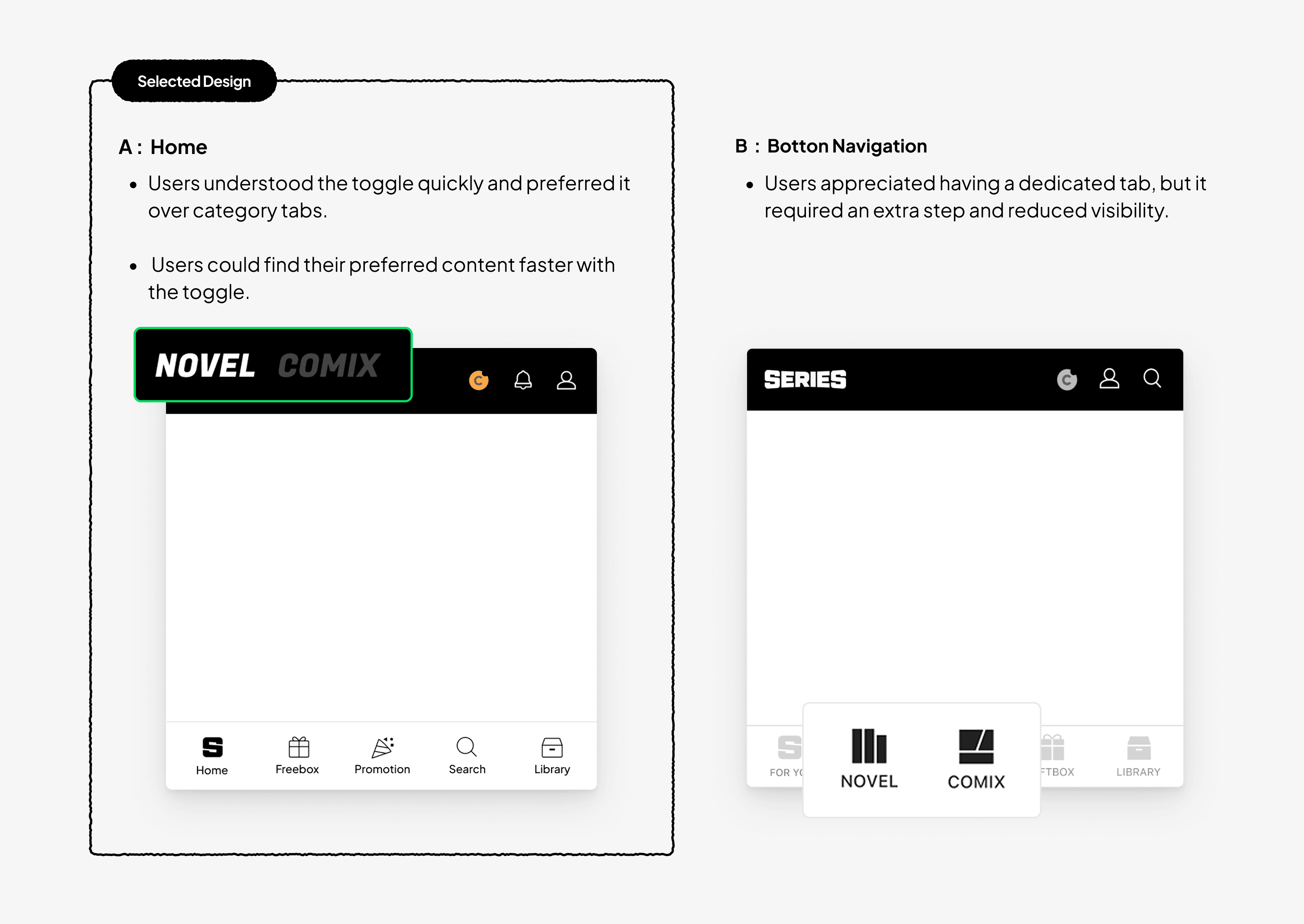 I tested multiple navigation models to understand which structure helped users switch between Novel and Comix content with the least effort. Since overall content discovery was declining, it was essential to validate which design reduced cognitive load and aligned with users’ natural switching patterns.