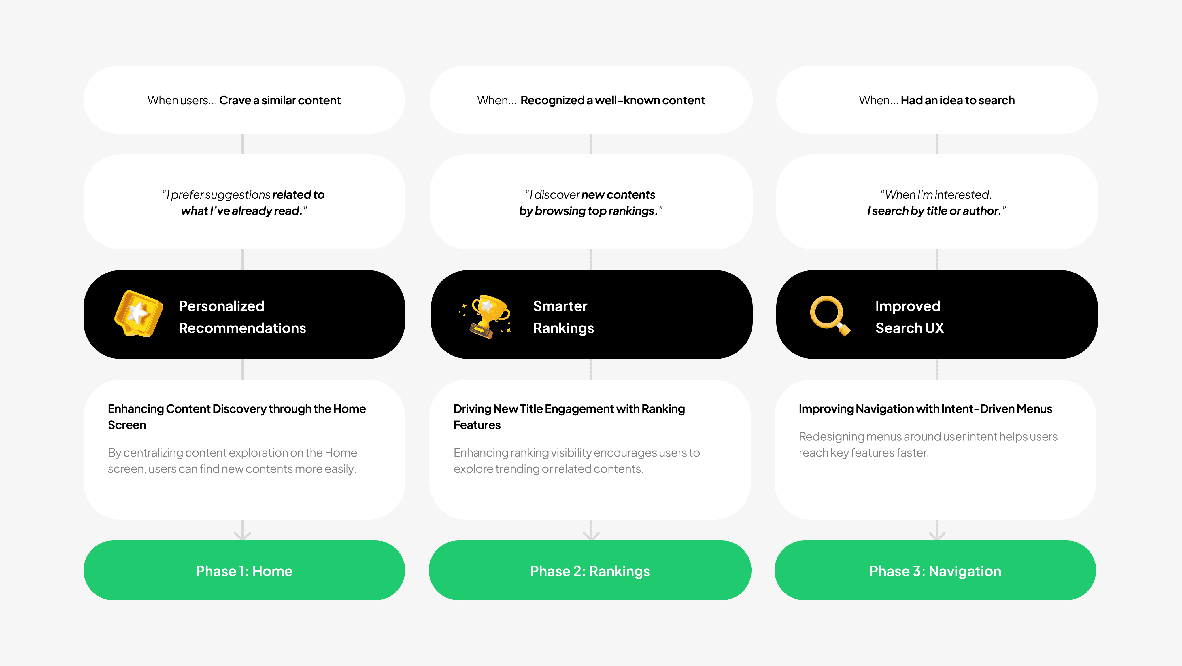 Through in-depth user interviews, I uncovered three core discovery patterns that explain when and why users explore new titles. These insights directly shaped our three main solution directions.
