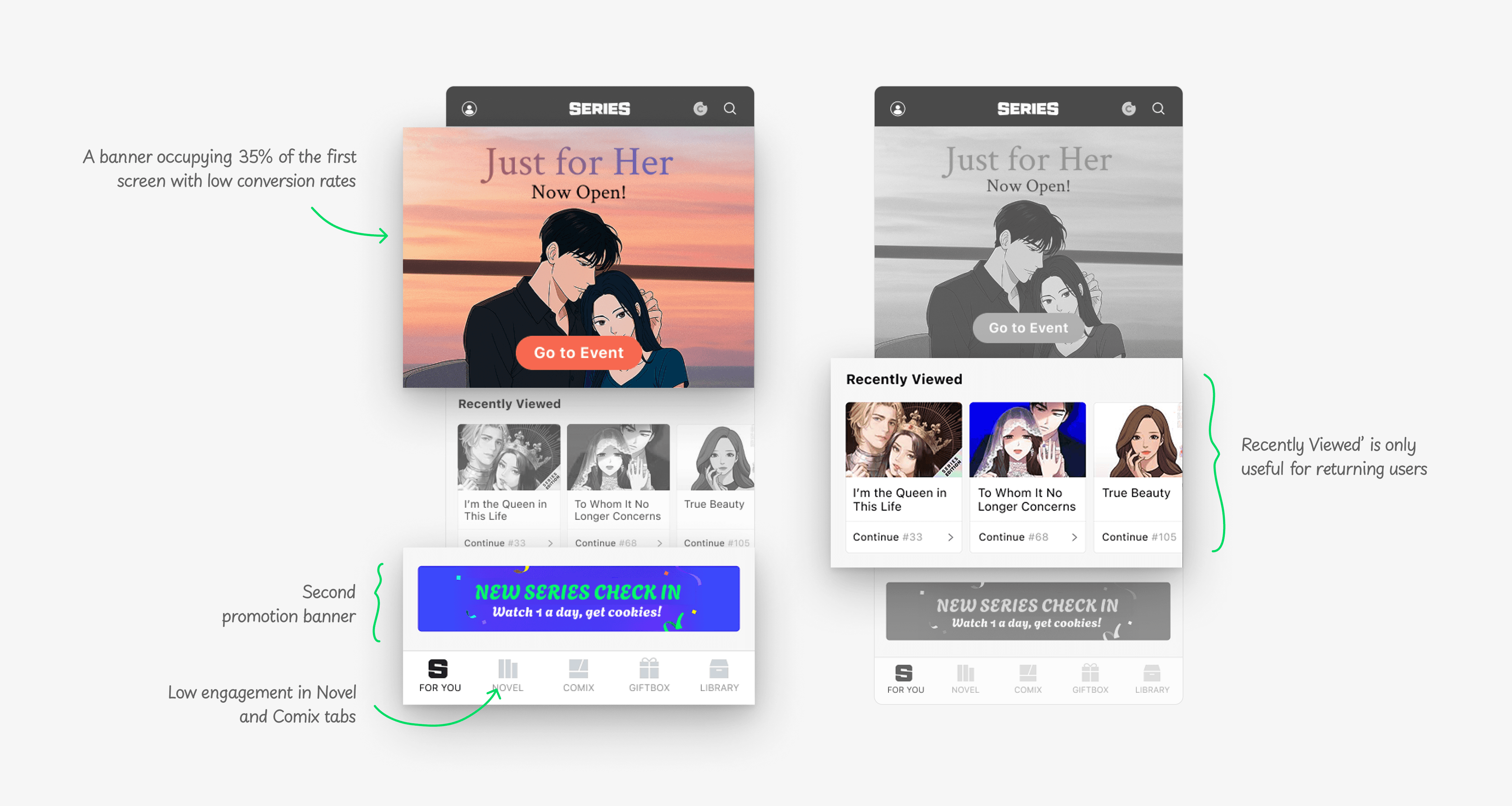 The home layout prioritized "Recently Viewed," hindering new content discovery and causing engagement drops. New users without viewing history lacked clear entry points, leading to confusion and low retention.