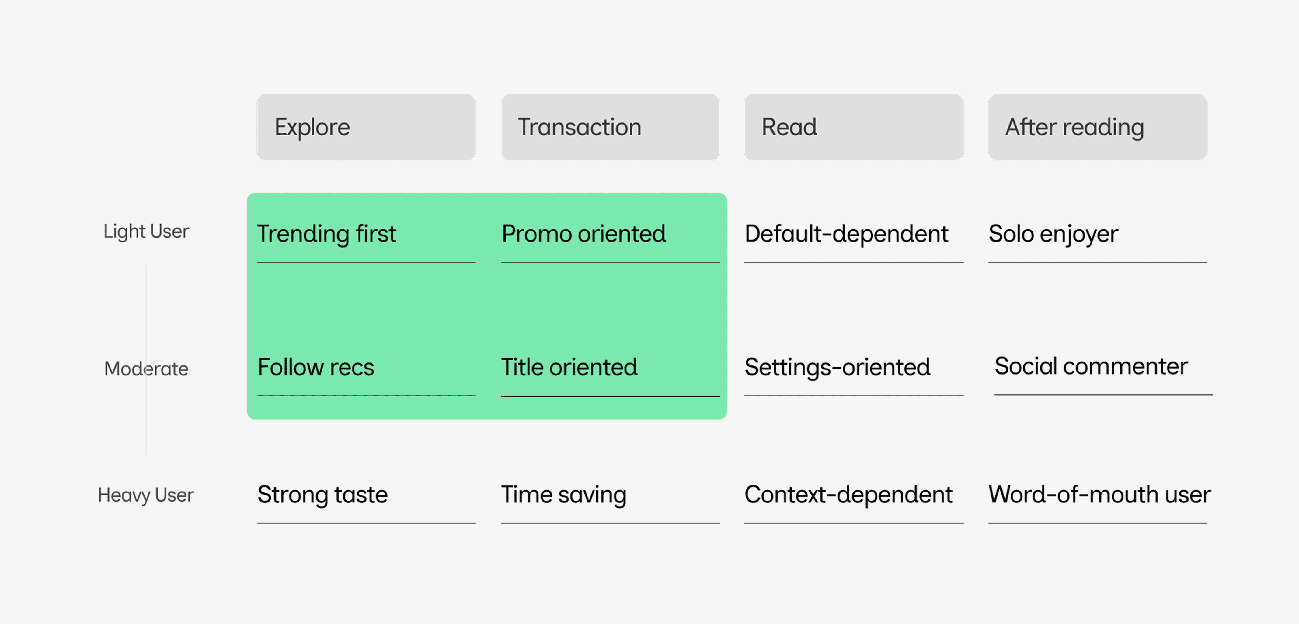 Light users were discount-driven, while moderate users relied on search for trending titles. We optimized their journey from exploration to purchase based on these insights.