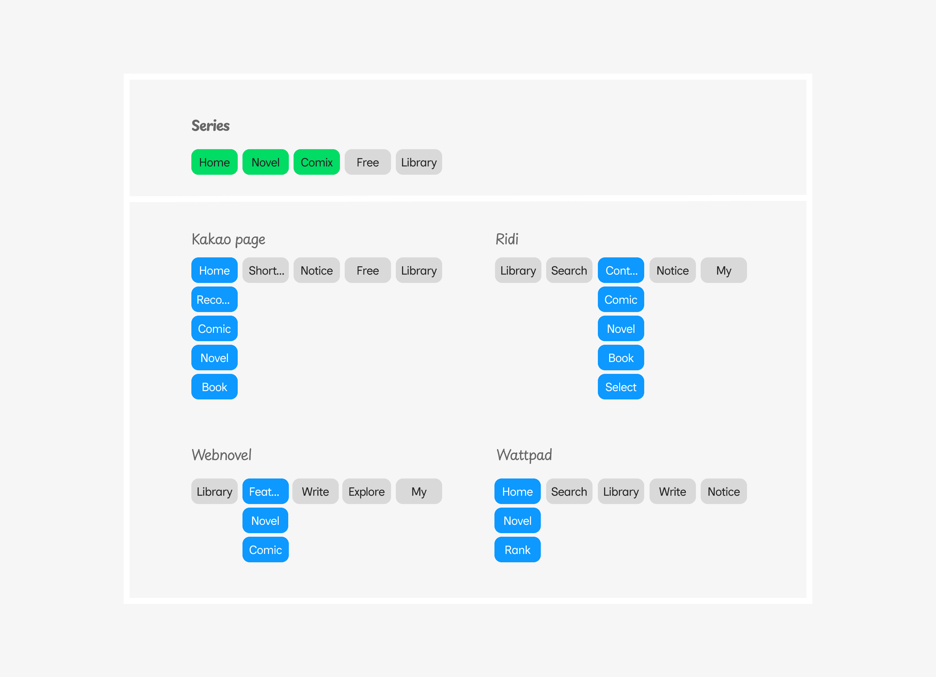 In contrast, Series app used content-based menus (e.g., Comix, Novel), while competitors focused on user goals with tabs like Home, Notice, and Search.