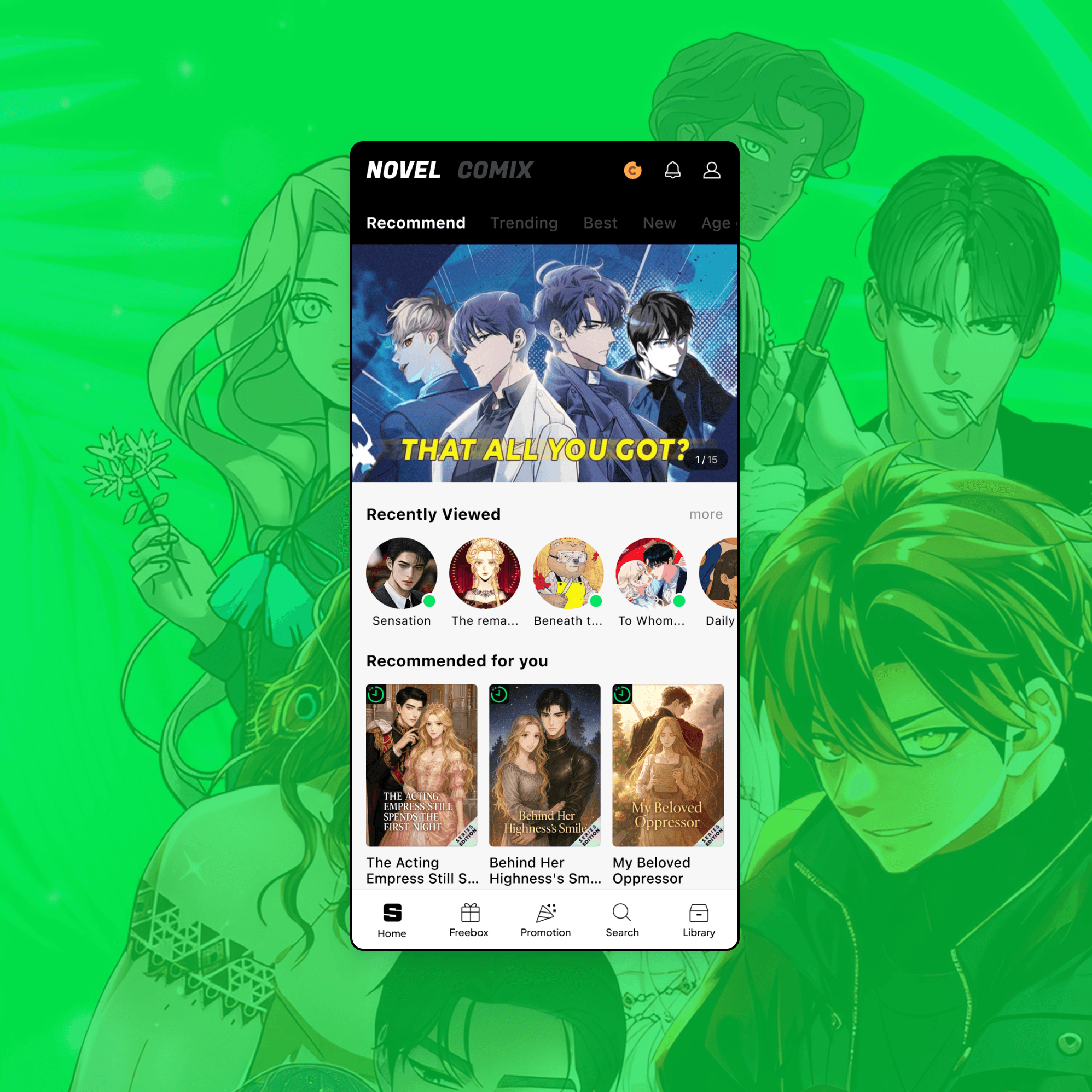 Large event banners dominated the first screen, while underutilized Novel/Comix tabs in bottom navigation limited content discovery.