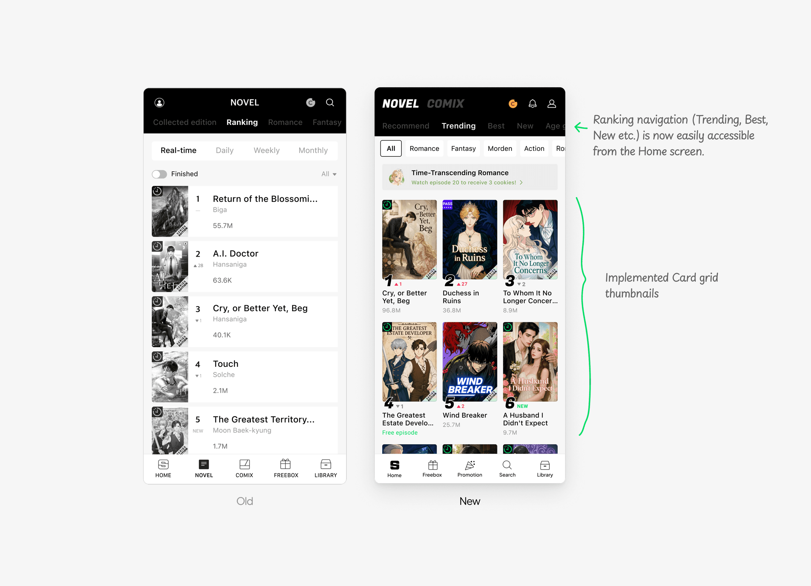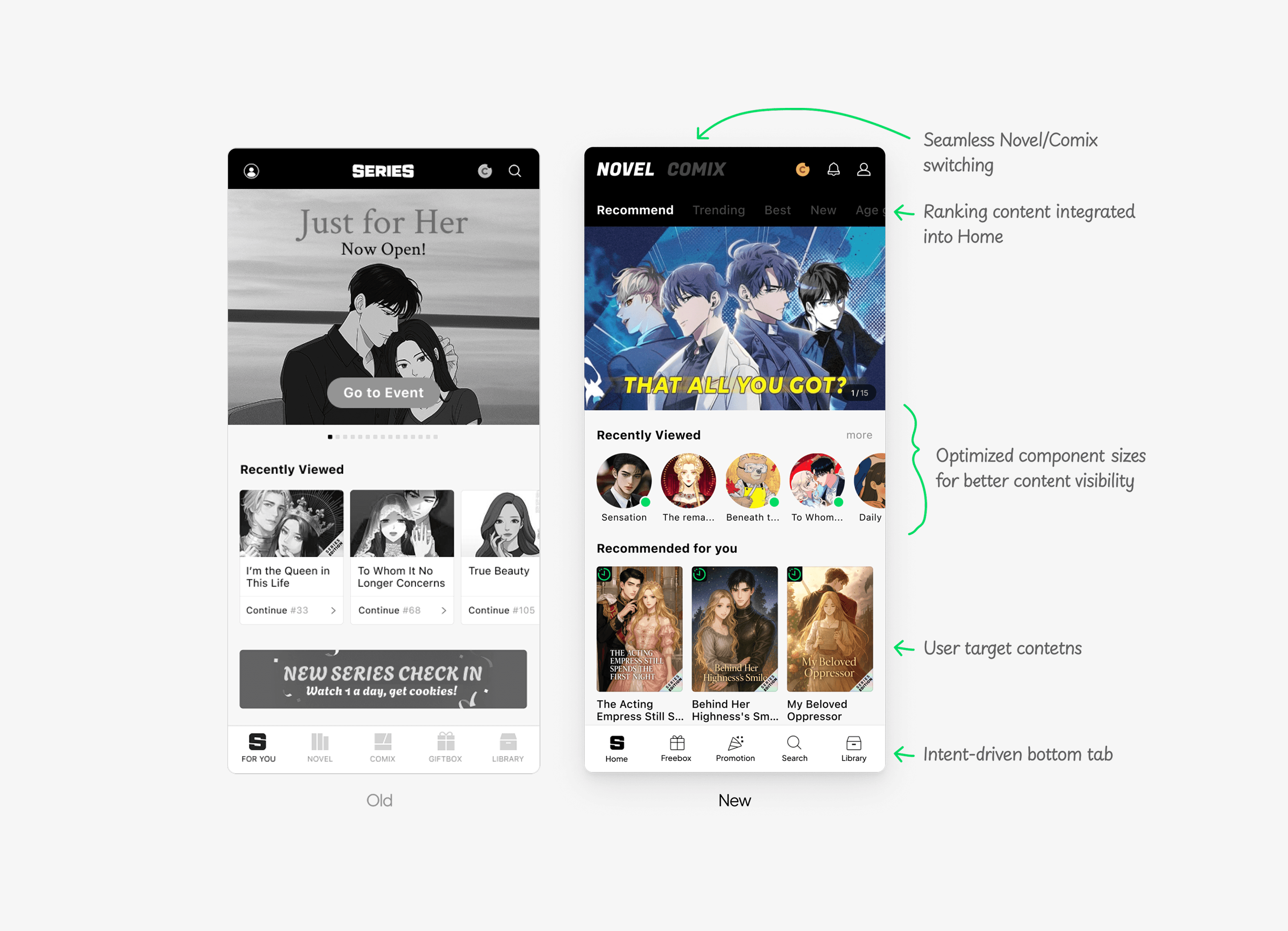 Redesigning menus based on user intent will help them find desired features more easily. Instead of Novel and Comix categories, persona-driven features like Promotions and Search should take priority